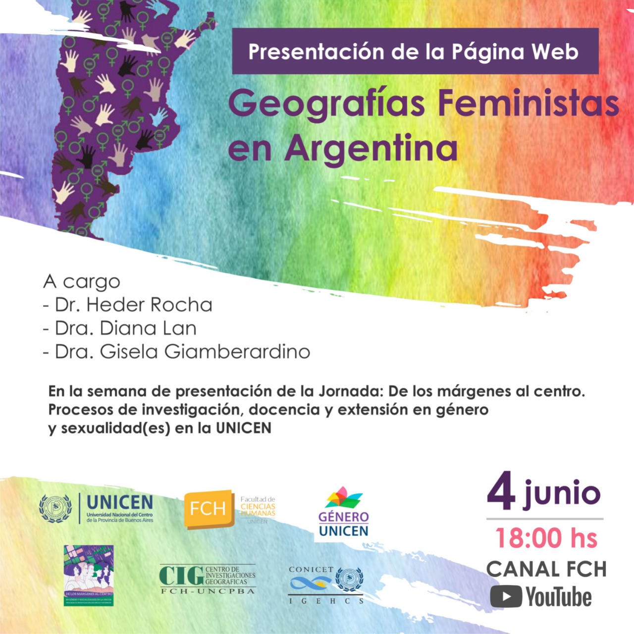 El viernes 4 de junio a las 18 hs. en nuestro canal de YouTube se presentará la página web “Geografías Feministas en Argentina”.  La actividad se desarrolla en el marco de la semana de presentación de las Jornadas “De los márgenes al centro. Procesos de Investigación, Docencia y Extensión en género y sexualidad(es) en la UNICEN”. Estas jornadas son el resultado de un trabajo impulsado por el Programa de Género de UNICEN con la activa participación de los niveles de pre grado, grado y posgrado de los distintos claustros, de los sindicatos de docentes y nodocentes, así como de equipos de cátedra, de investigación y de extensión, de las distintas Unidades Académicas de la UNICEN.